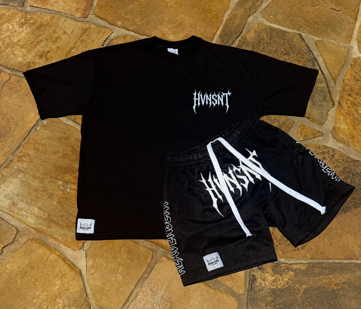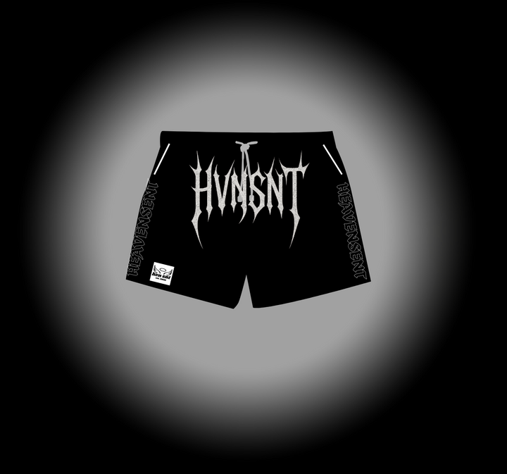 Full blackout mode. The BLKOUT shorts fuse aggressive energy with breathable performance. Featuring our spiked HVNSNT logo across the front and “HEAVENSENT” running down both legs, these mesh shorts are loud in all the right ways. Lightweight feel, heavy statement.