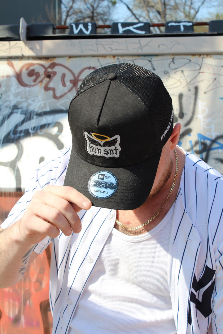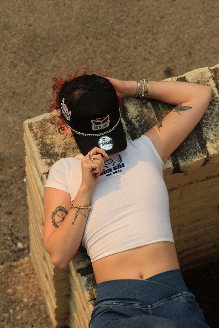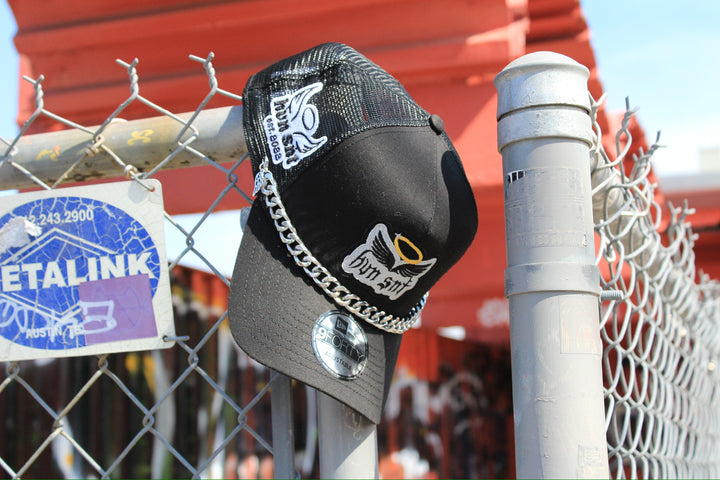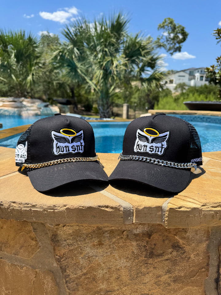 Built to stand out. The Chain Hat is a high-impact trucker featuring our signature halo-wing patch and a heavyweight silver or gold chain across the brim. Finished with side “Heaven Sent” branding and crafted on an high quality manufactured hat for a perfect fit and feel.